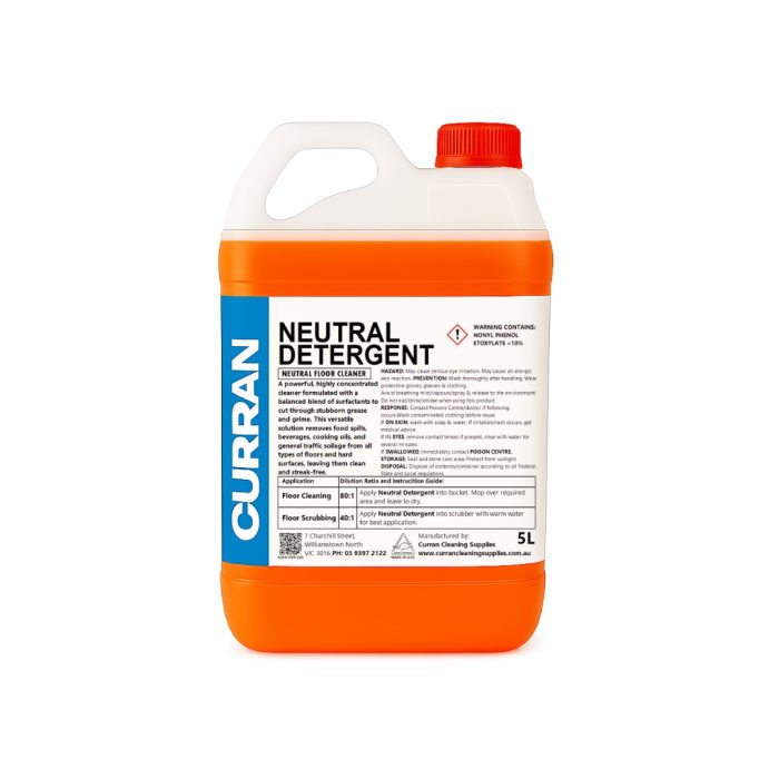 NEUTRAL DETERGENT is a concentrated, high-foam, neutral cleaner. This highly active cleaner, dilutes up to 1 in 400. It suspends dirt and soil, ripping through fatty residues, and can’t be beaten for dishwashing, remaining gentle on hands.
